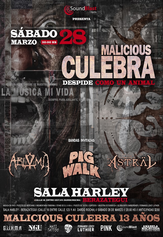 El próximo sábado 28 de marzo, a partir de las 20:00hs. MALICIOUS CULEBRA se presentará en Sala Harley, Berazategui. Un lugar que es parte de la vida de la banda y que los albergará una vez más en esta noche tan importante para los músicos y, seguramente, para todos los fanáticos.